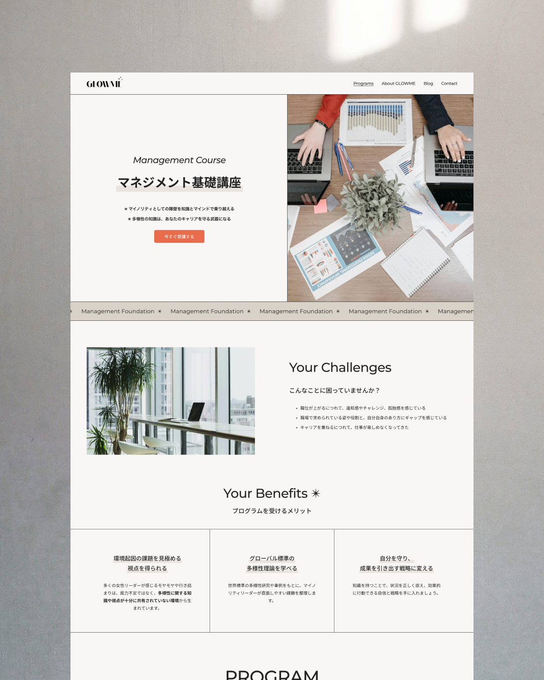 今回のサイト制作では、1on1・グループコーチング・オンラインコース・法人向けプログラムなど多岐にわたるサービスを、迷わず比較・選択できる導線設計に重点を置きました。