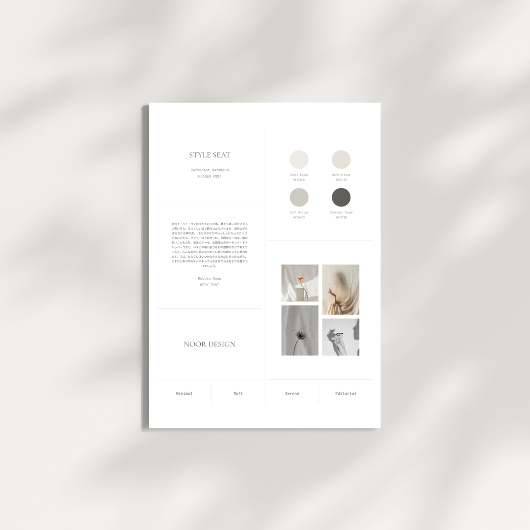 配色・フォント・ムードボードなどをまとめたスタイルガイドを作成し、ビジュアルの方向性をしっかり固めます。