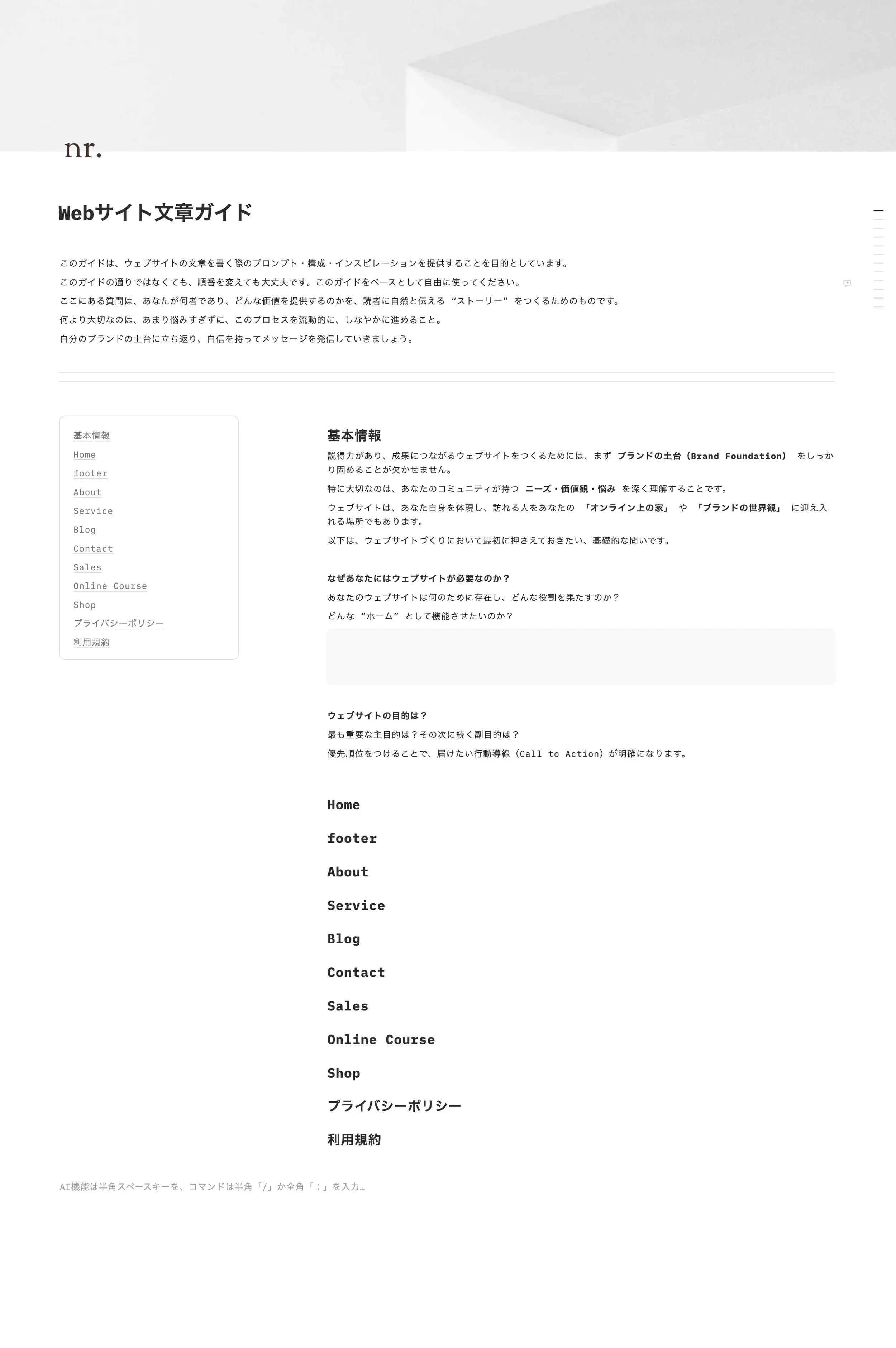 制作開始までに、ブランドディスカバリーシート・ウェブサイト文章作成ガイド・必要素材のリストアップなどのリソースを使って、あなたのブランドや提供サービス、想いを整理していきます。